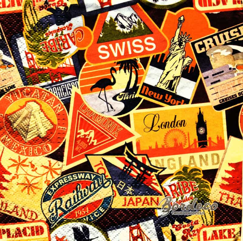 Dział sklepu Bordeco obejmujący serwetki do decoupage z motywami podróży, państw, miast, krajobrazów, chętnie wykorzystywanymi w decoupage do ozdabiania np. pudełek czy kuferków z pamiątkami z podróży.