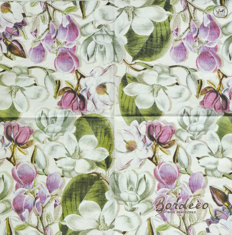 Serwetka do decoupage firmy MICHEL z motywem białych i różowych magnolii 33x33cm. Unikat.