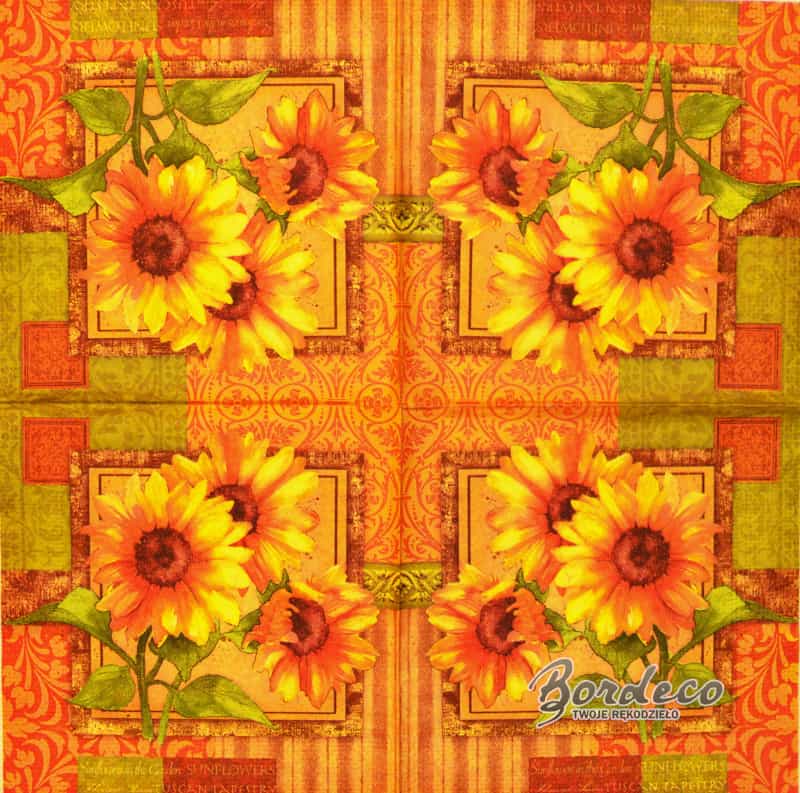Serwetka do decoupage firmy ATELIER z motywem bukietu trzech słoneczników 33x33cm. Unikat.