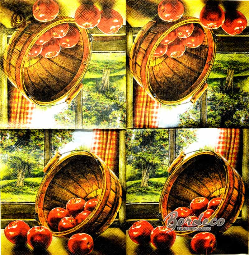 Serwetka do decoupage firmy PUNCH STUDIO z motywem czerwonych jabłek na parapecie okna 25x25cm. Unikat.