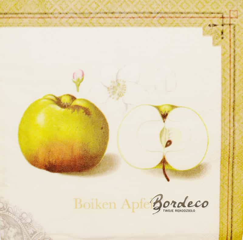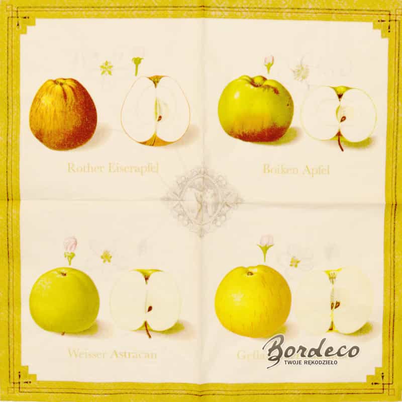 Serwetka do decoupage firmy RANNENBERG & FRIENDS z motywem czterech jabłek i połówek jabłek 33x33cm. Unikat.
