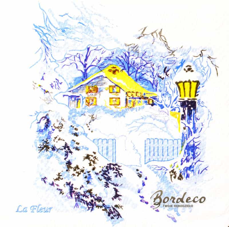 Serwetka do decoupage firmy LA FLEUR z motywem zimowego widoczka 33x33cm. Serwetka karbowana. Unikat