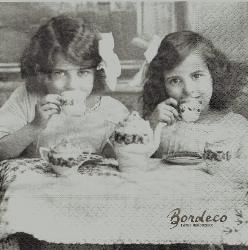 Serwetka do decoupage firmy SAGEN w stylu Vintage z motywem dziewczyńskich ploteczek przy filiżance aromatycznej herbaty 33x33cm.