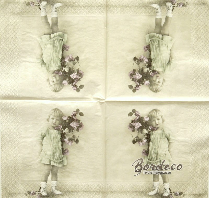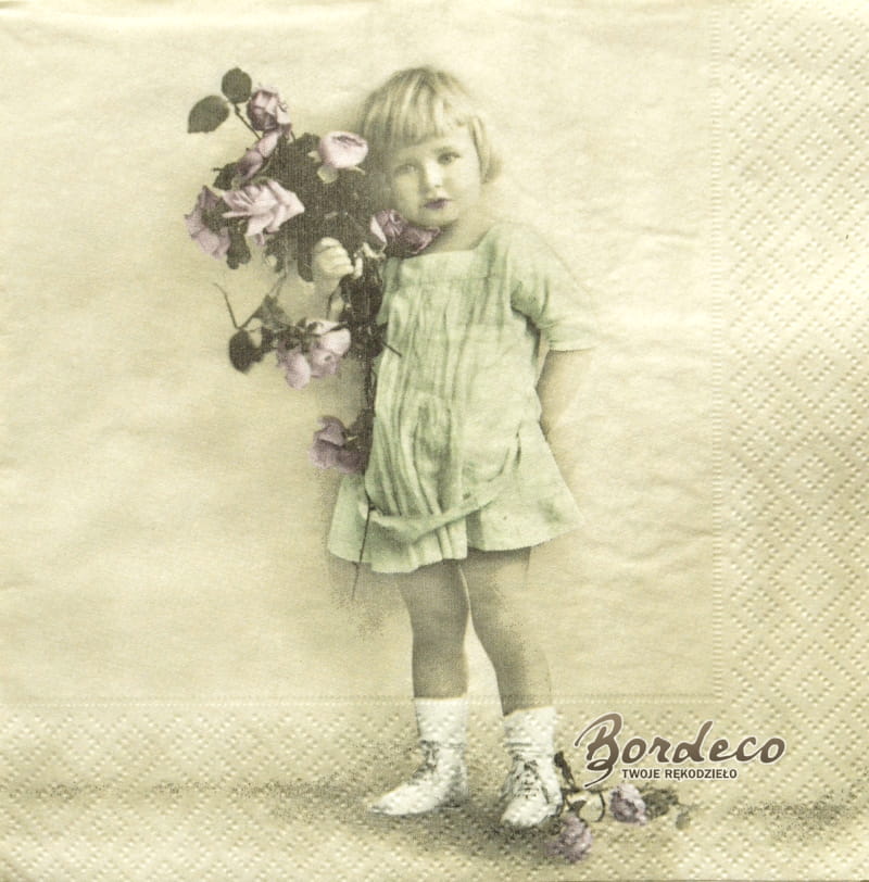 Serwetka do decoupage firmy SAGEN w stylu Vintage z motywem dziewczynki ubranej w zieloną sukienkę i z wiązanką róż w dłoniach 33x33cm.