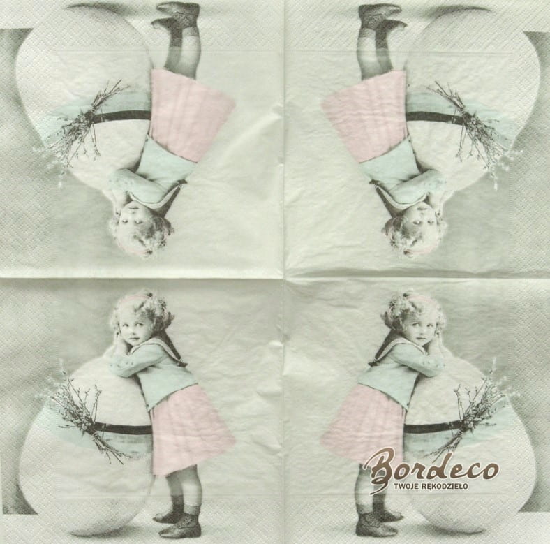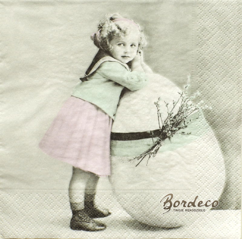 Serwetka do decoupage firmy SAGEN, seria "stare fotografie" - dziewczynka z mega wielką pisanką 33x33cm.