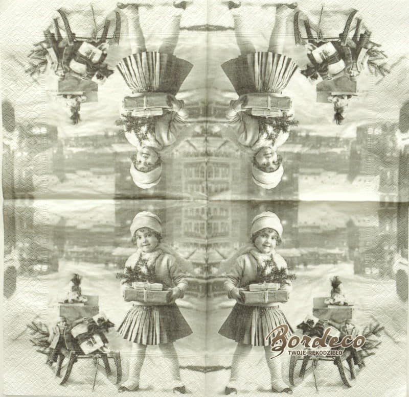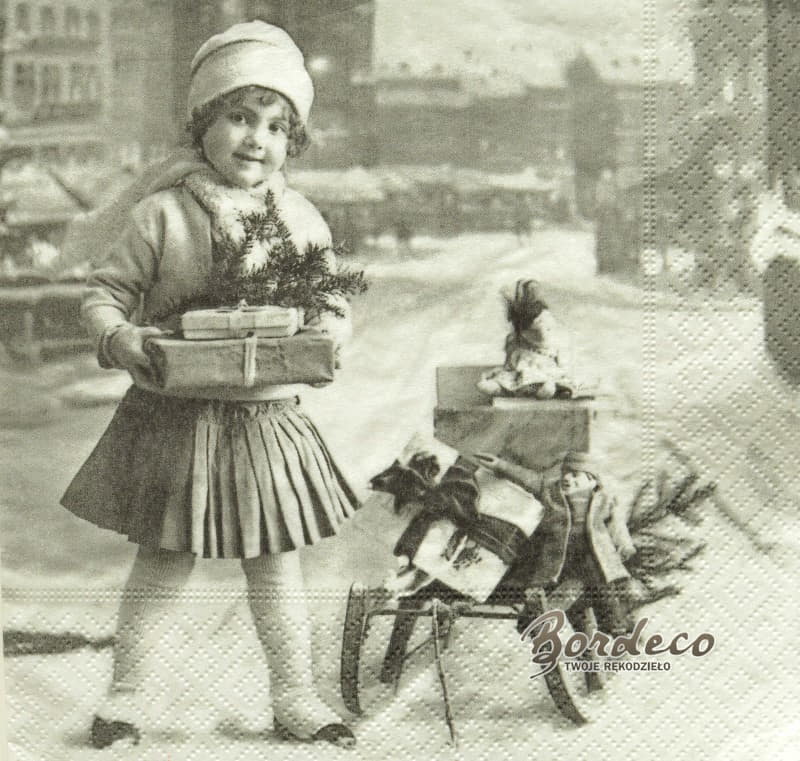 Serwetka do decoupage firmy SAGEN w stylu Vintage z motywem dziewczynki z sankami trzymającej świąteczny prezent w dłoniach 33x33cm.