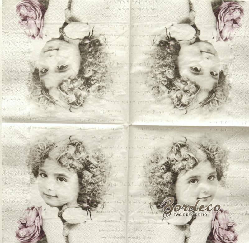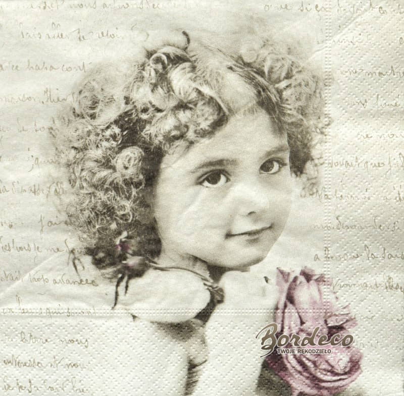 Serwetka do decoupage firmy SAGEN w stylu Vintage z motywem portretu dziewczynki trzymającej różę w dłoniach 33x33cm.