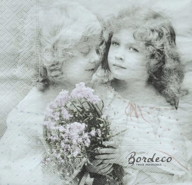 Serwetka do decoupage firmy SAGEN z motywem portretu dziewczynek w bluzeczkach w kropeczki i bukietem polnych kwiatów między nimi 33x33cm.