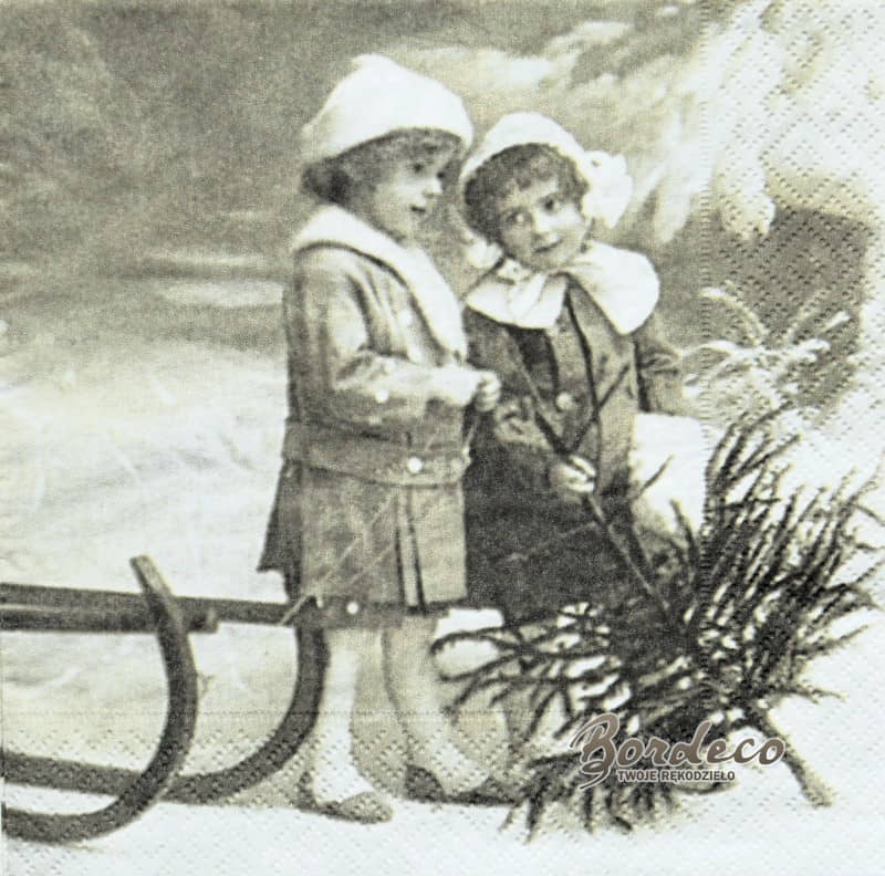 Serwetka do decoupage firmy SAGEN w stylu Vintage z motywem dziewczynek niosących z lasu żywą choinkę 33x33cm.