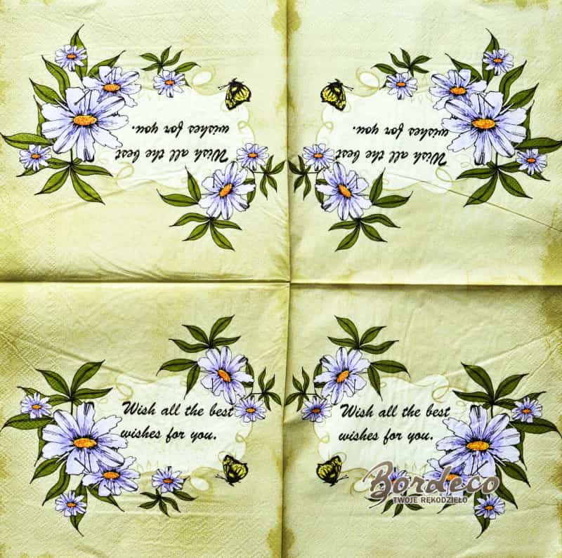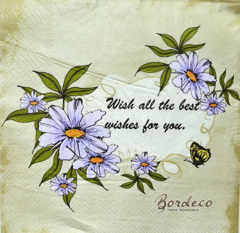 Serwetka do decoupage seria PIXIE DESIGN z motywem fioletowych kwiatów i życzeń 33x33cm.Unikat.