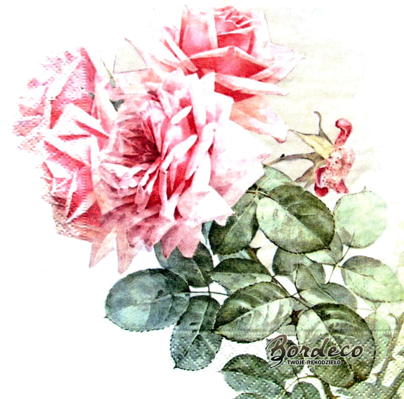 Serwetka do decoupage firmy SAGEN w stylu Vintage z motywem położonych skośnie gałązek dużych róż 33x33cm.