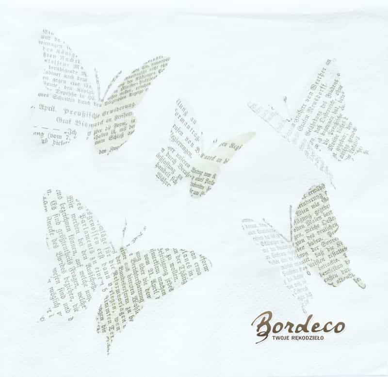 Serwetka do decoupage seria ATELIER . firmy Braun+Company z motywem gazetowych motyli 33x33cm. Unikat.