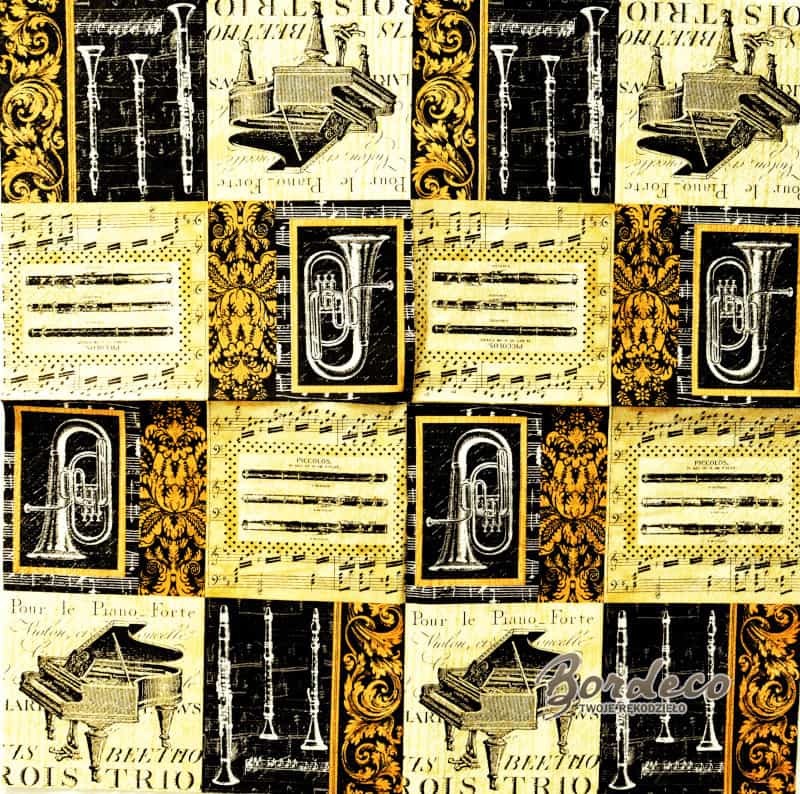 Serwetka do decoupage firmy PAW z motywem instrumentów muzycznych, fortepianu, tuby, fletu i klarnetu, 33x33cm. Unikat