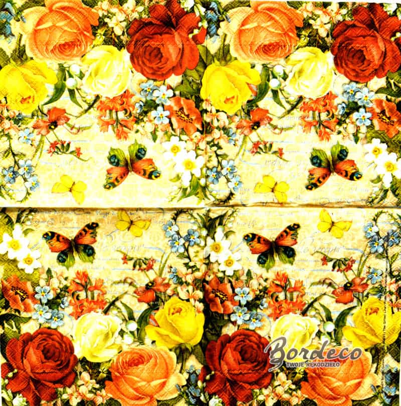 Serwetka do decoupage firmy PUNCH STUDIO z motywem kolorowych róż i innych kwiatów 25x25cm. Unikat.