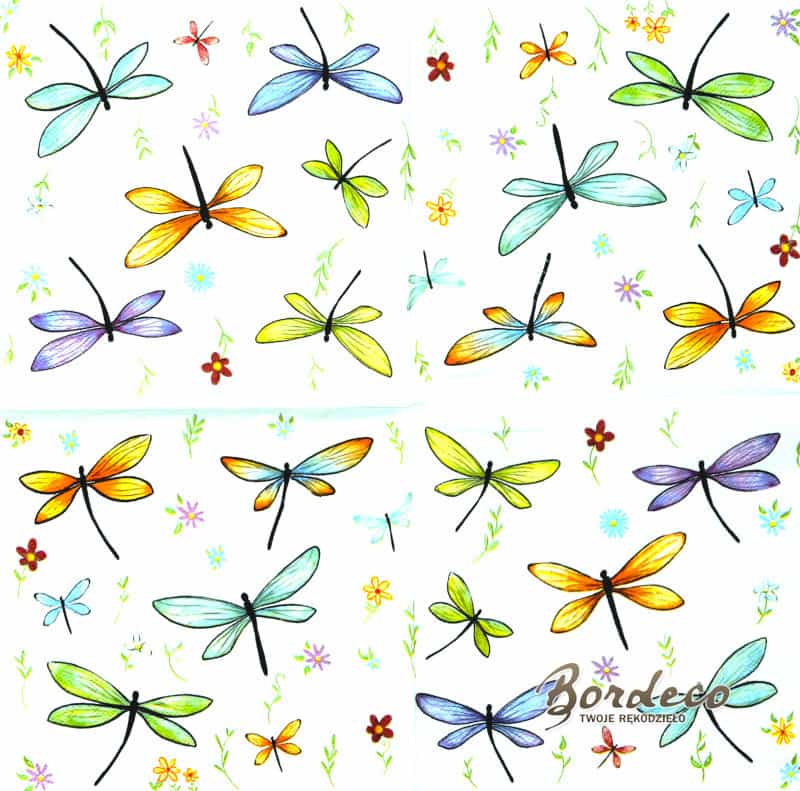 Serwetka do decoupage seria DAISY z motywem kolorowych ważek i kwiatków 33x33cm. Unikat