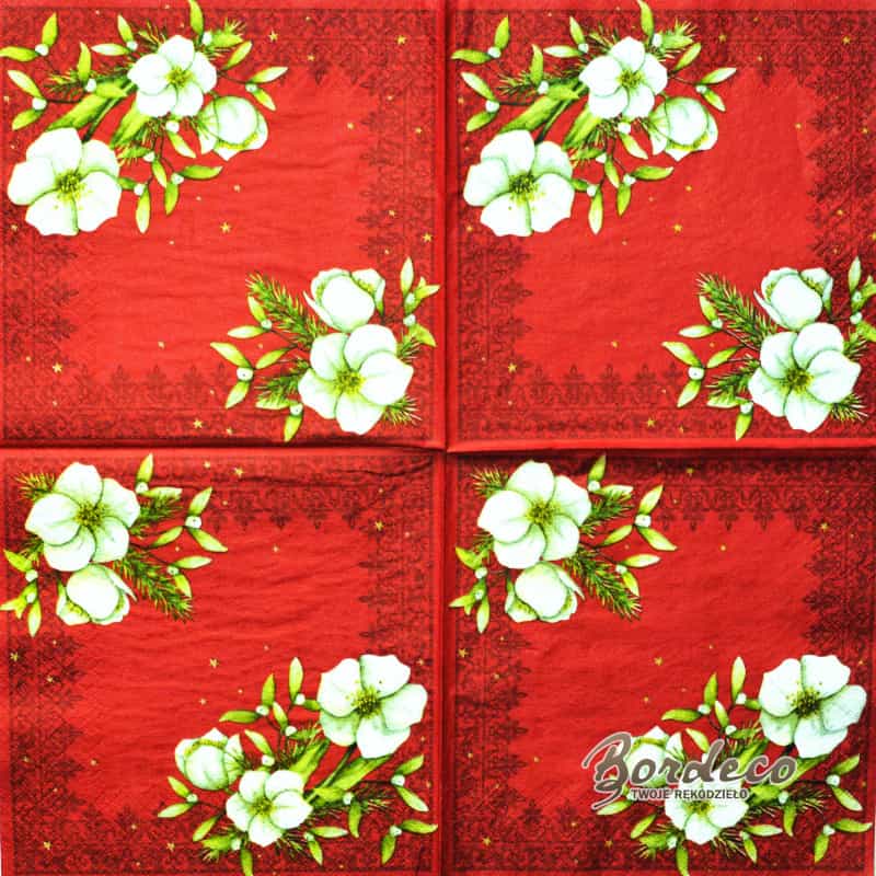 Serwetka do decoupage seria DAISY z motywem ciemiernika i jemioły na czerwonym tle 33x33cm. Unikat