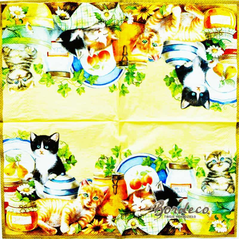 Serwetka do decoupage firmy Paper+Design  z motywem kotków w kuchni 33x33.cm. Unikat