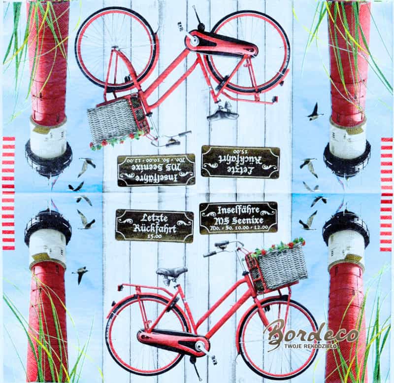 Serwetka do decoupage firmy Paper+Design  z motywem latarnia morska i rower z koszem  33x33.cm. Unikat