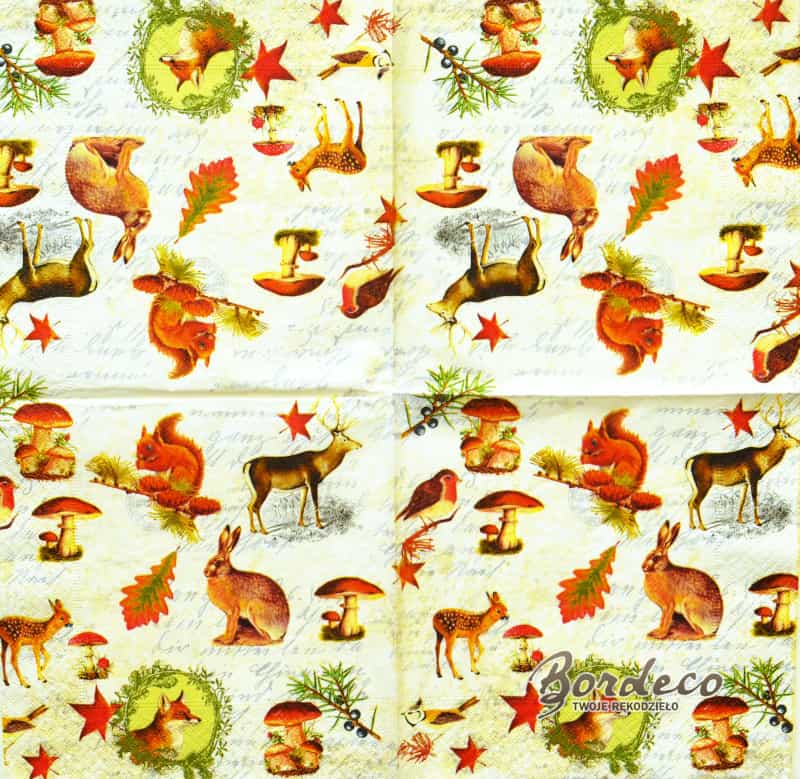 Serwetka do decoupage firmy Paper+Design  z motywem leśne zwierzęta, grzyby i liście 33x33.cm. Unikat