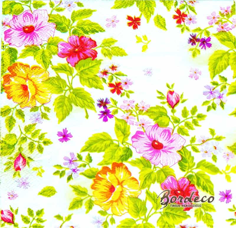 Serwetka do decoupage firmy RAVI z motywem malowanych kolorowych kwiatów 33x33cm. Unikat.