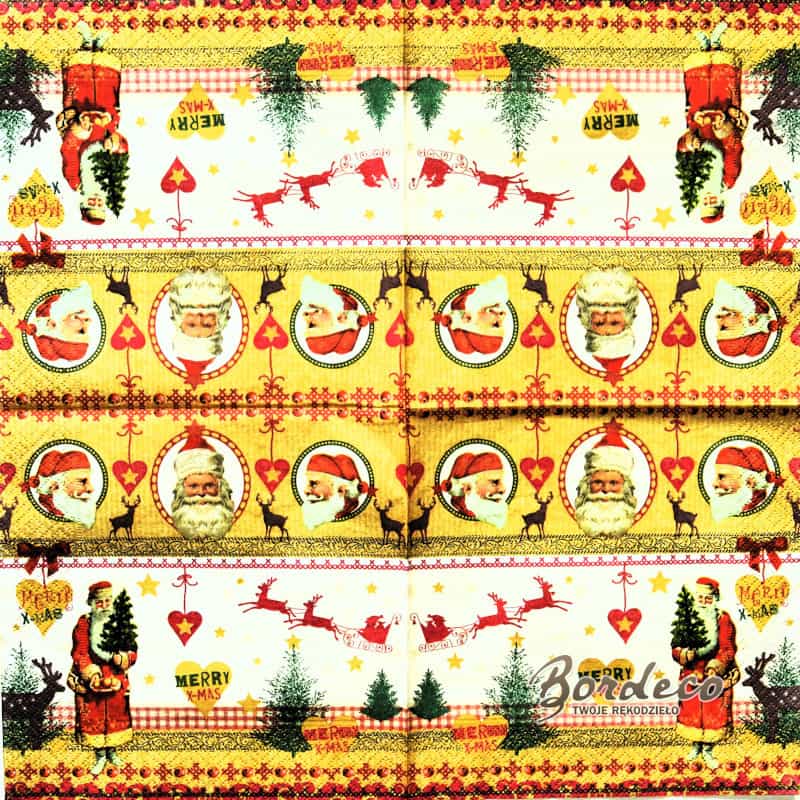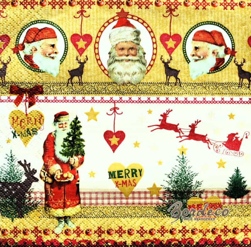 Serwetka do decoupage firmy Paper+Design  z motywem Mikołaja i symboli bożonarodzeniowych 33x33.cm. Unikat
