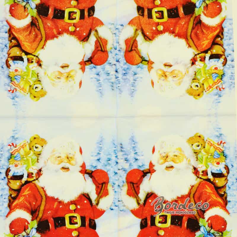 Serwetka do decoupage firmy DUNI z motywem Mikołaja z workiem prezentów 33x33cm. Unikat.