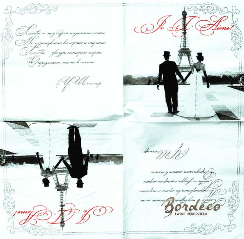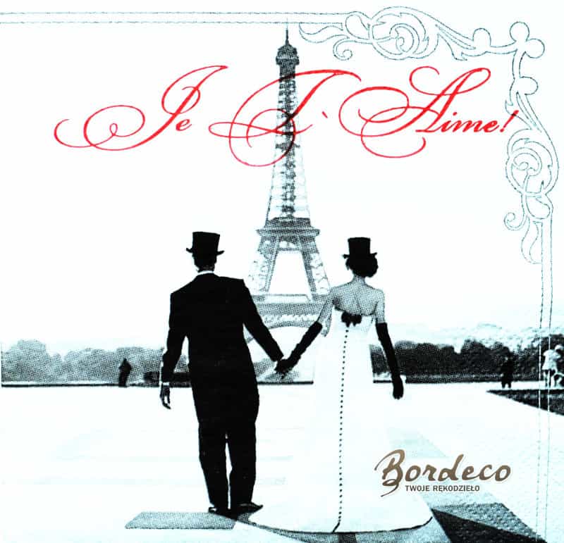 Serwetka do decoupage firmy LUXY TM z motywem zakochanej pary w cylindrach przy wieży Eiffla 33x33cm. Unikat.