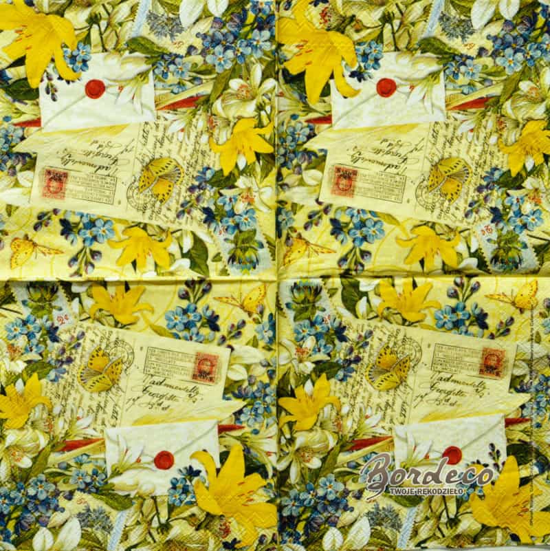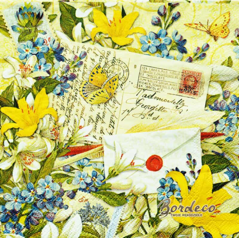 Serwetka do decoupage firmy PUNCH STUDIO z motywem kolorowych kwiatów  i listu 25x25cm. Unikat.