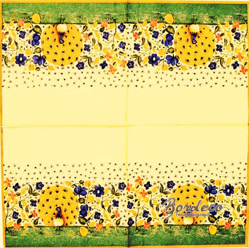 Serwetka do decoupage firmy RANNENBERG & FRIENDS z motywem pawia wśród kwiatów 33x33cm. Unikat.
