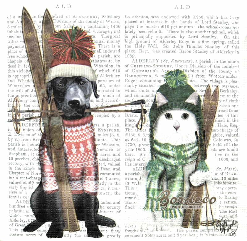 Serwetka do decoupage firmy PPD z motywem narciarskiego duetu - odpowiedzialnego, wiernego psa i zrelaksowanego kota hulaki 33x33. Tło - fragment słownika w języku angielskim.