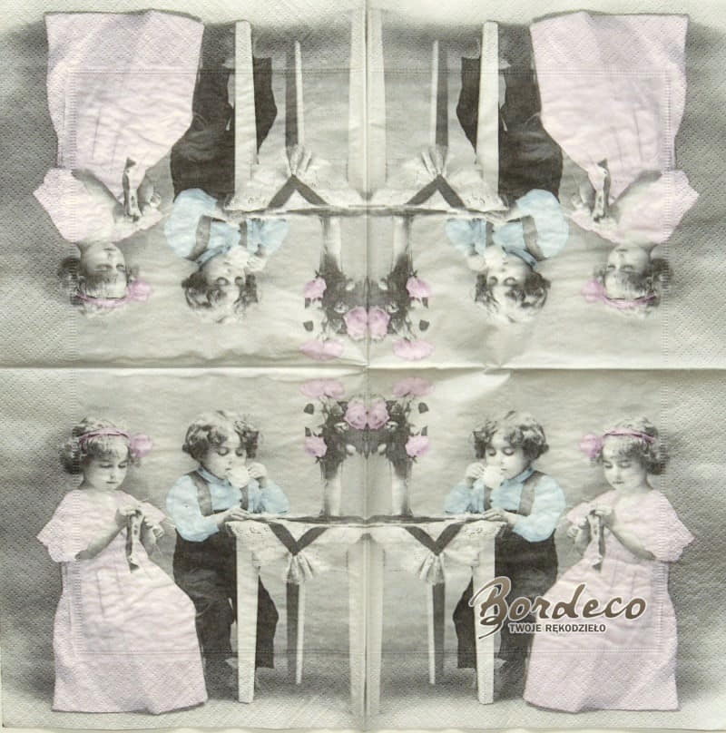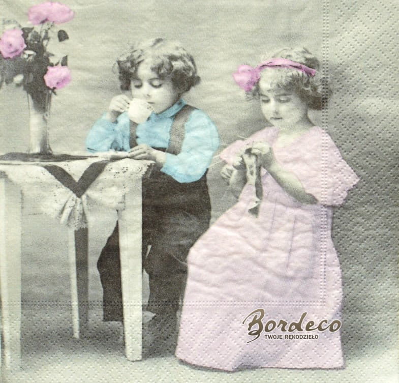 Serwetka do decoupage firmy SAGEN w stylu Vintage z motywem dzieci przypominających małżeńską parę spędzająco miło popołudnie na popijaniu herbaty, czytaniu gazety i szydełkowaniu 33x33cm.