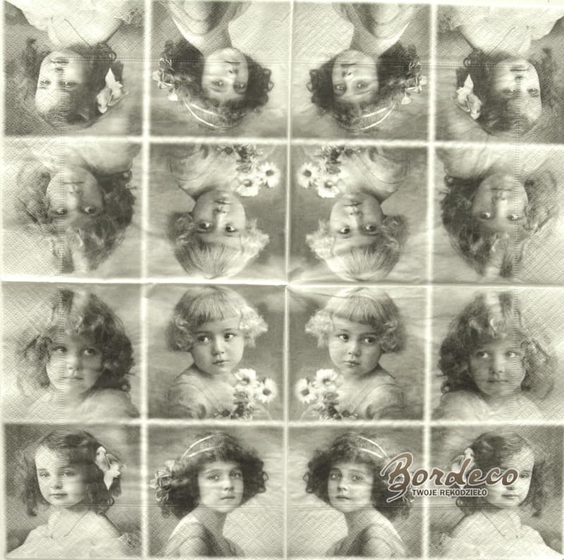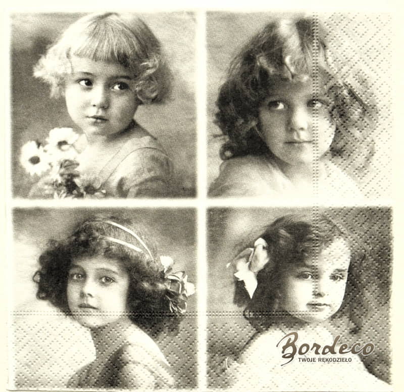 Serwetka do decoupage firmy SAGEN w stylu Vintage z motywem czterech portretowych fotografii dziewczynek 33x33cm.