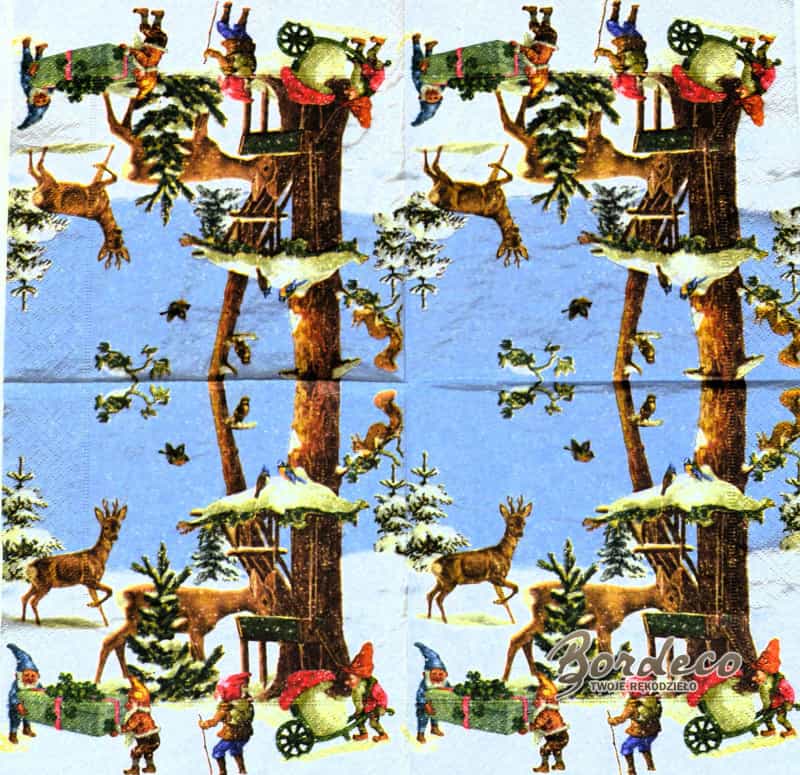 Serwetka do decoupage firmy Paper+Design  z motywem pracowitych krasnoludków i jelonków przy paśniku 33x33.cm. Unikat