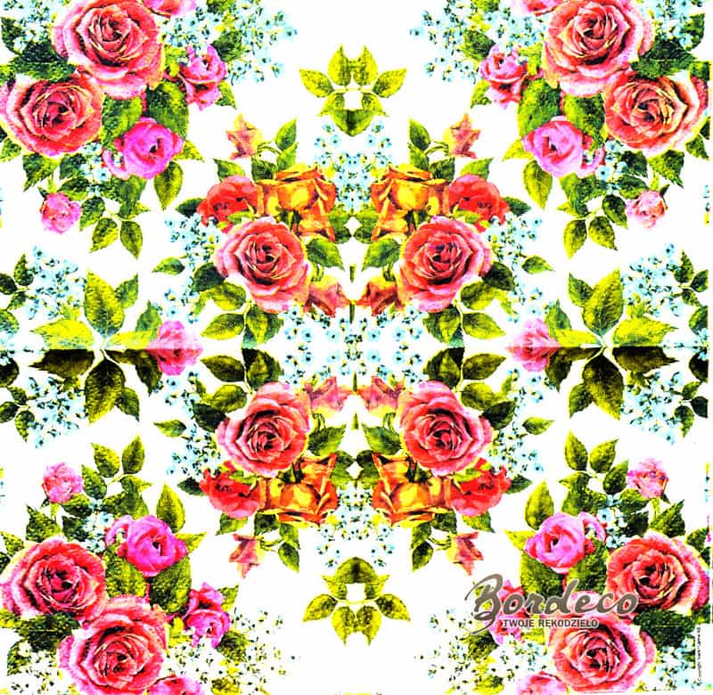 Serwetka do decoupage seria PIXIE DESIGN z motywem bukietów róż i niezapominajek 25x25cm.Unikat.