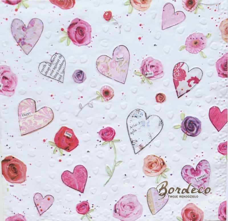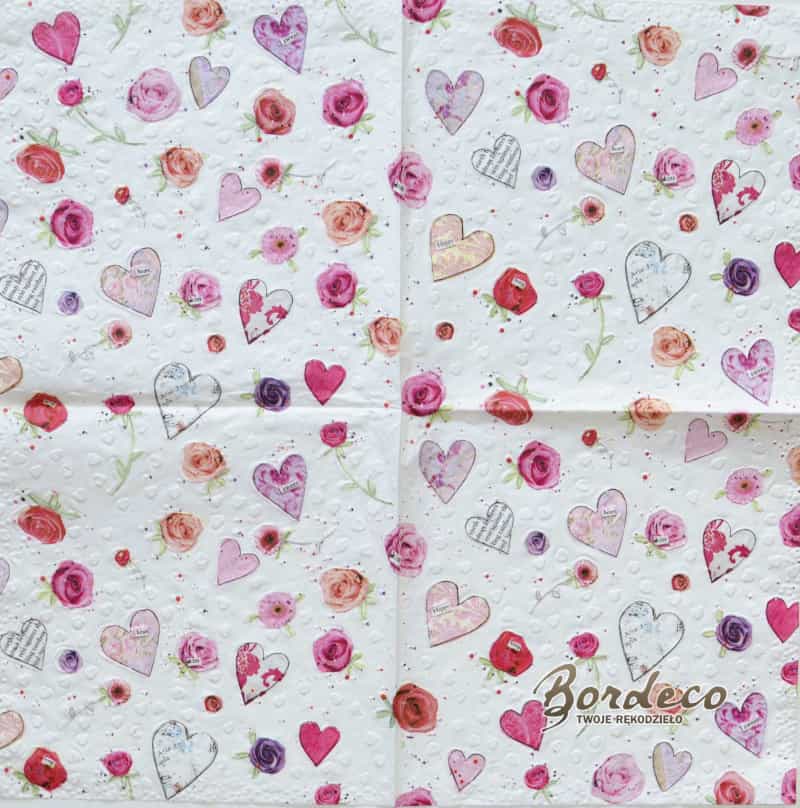 Serwetka do decoupage firmy Paper+Design  z motywem serduszka i małe różyczki  33x33.cm. Unikat