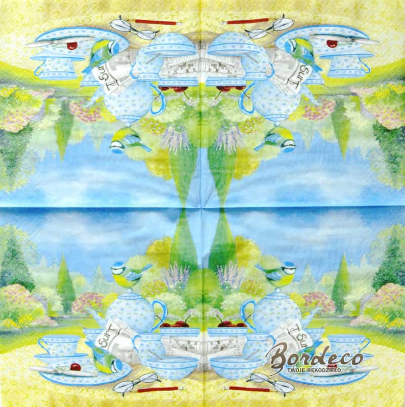 Serwetka do decoupage firmy JET PAPER seria TI-FLAIR z motywem sikorek przy śniadaniowym stole 33x33cm. Unikat