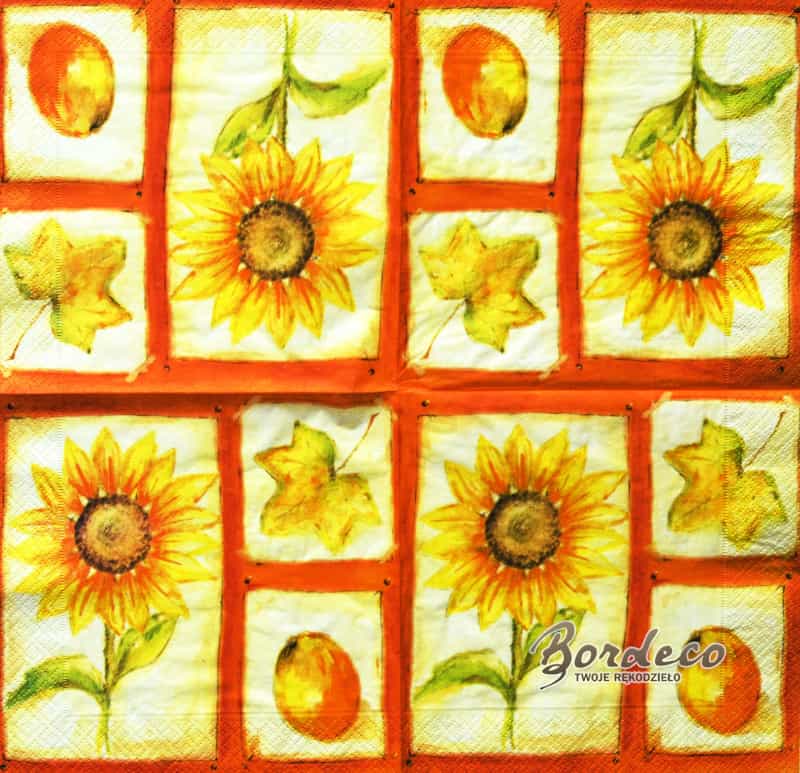 Serwetka do decoupage seria AHA z motywem słonecznika, liścia i owocu 33x33cm. Unikat.