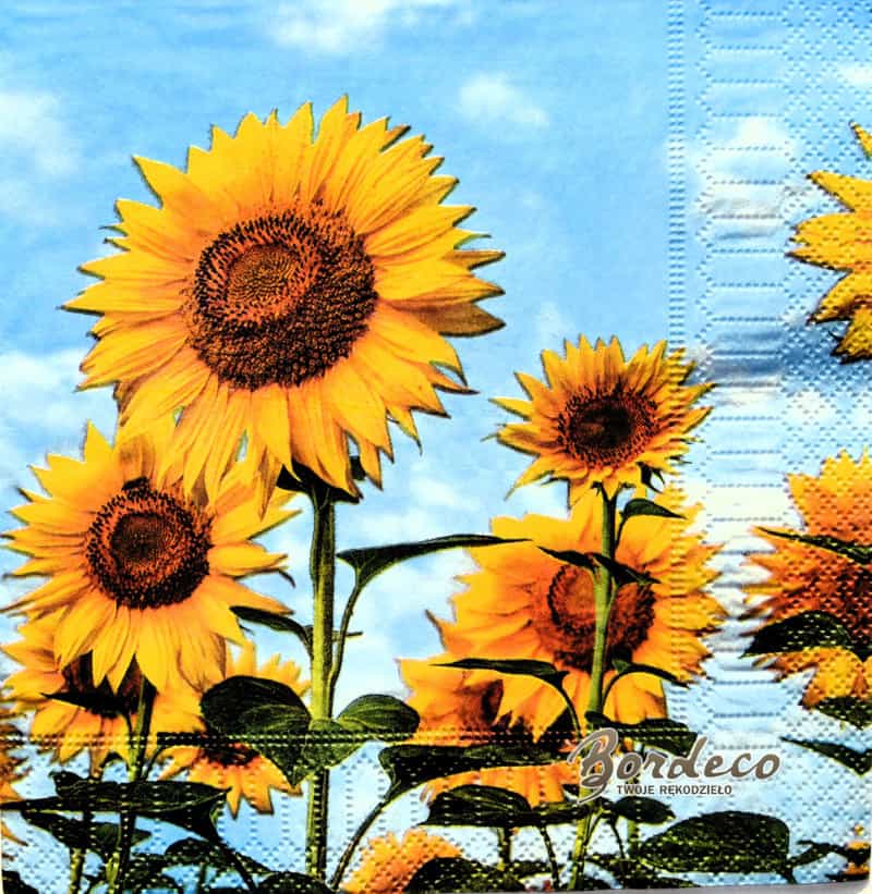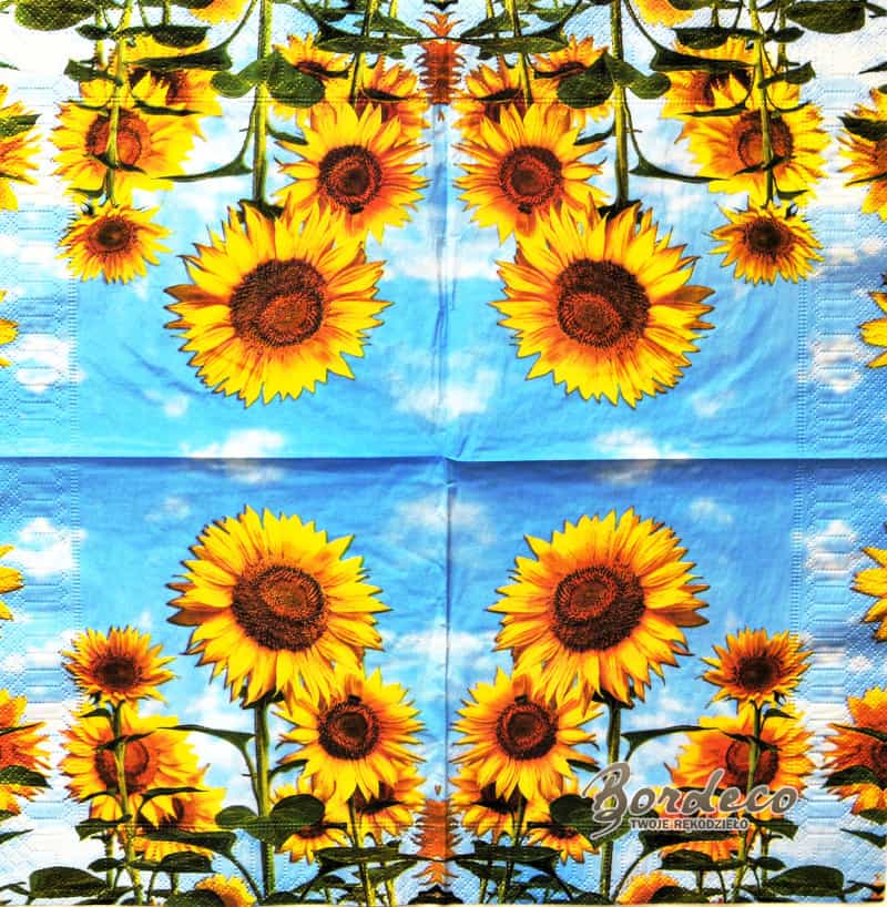 Serwetka do decoupage firmy HANKE TISSUE seria HANKE z motywem słoneczników na tle nieba 33x33cm. Unikat