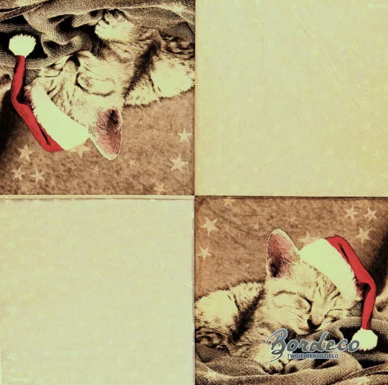 Serwetka do decoupage firmy STEWO z motywem śpiącego kotka w czapce Mikołaja 33x33cm. Unikat