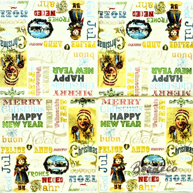 Serwetka do decoupage firmy Paper+Design  z napisami świątecznymi retro 33x33.cm. Unikat