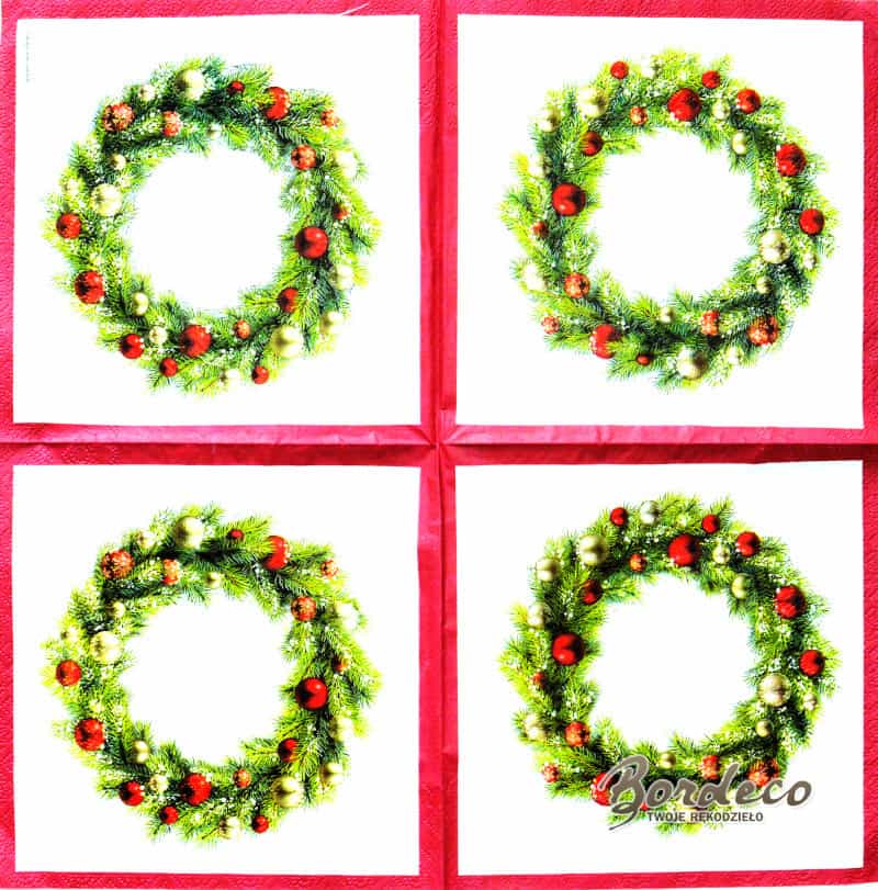 Serwetka do decoupage seria PIXIE DESIGN z motywem świątecznego wianka z bombkami 25x25cm.Unikat.