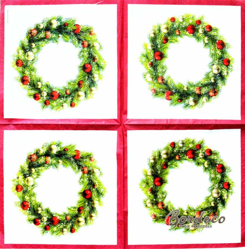 Serwetka do decoupage seria PIXIE DESIGN z motywem świątecznego wianka z bombkami 33x33cm.Unikat.