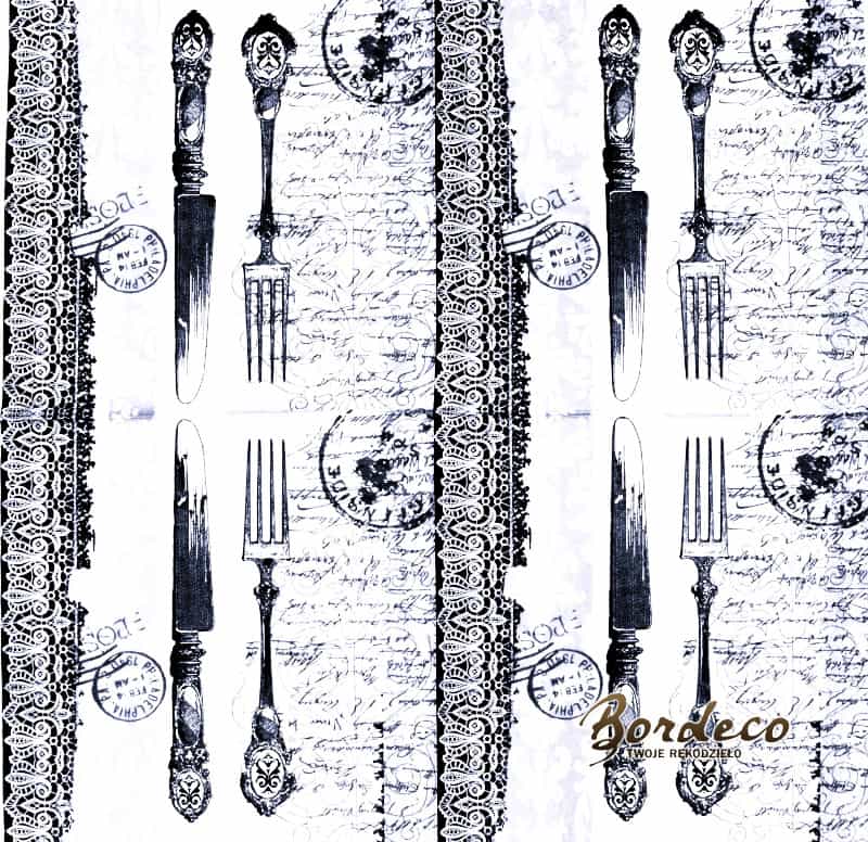 Serwetka do decoupage firmy PAPSTAR z motywem sztućce na koronkowym obrusie 33x33cm. Unikat.