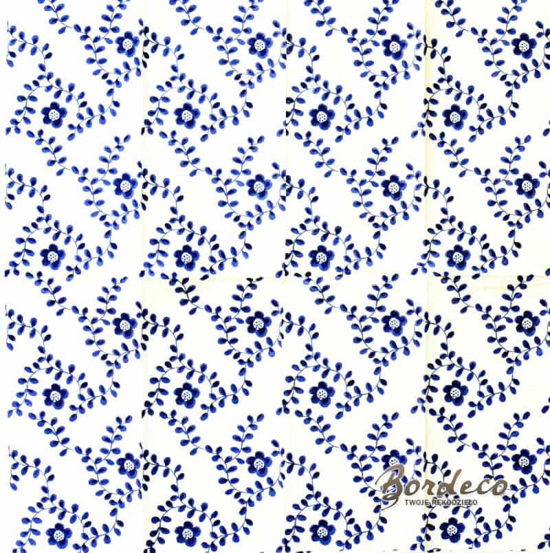 Serwetka do decoupage dystrybutora IKEA z motywem tapety w niebieskie kwiatuszki i listki 38x38cm. Większy rozmiar serwetki. Unikat.