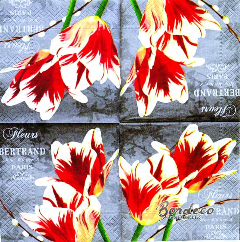 Serwetka do decoupage firmy Paper+Design  z motywem czerwono-białych tulipanów  25x25.cm. Unikat