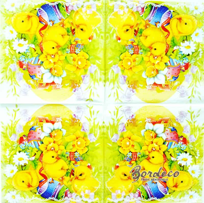 Serwetka do decoupage seria MAKI z motywem wielkanocnych pisklaków, pisanek i kwiatów 33x33cm. Unikat