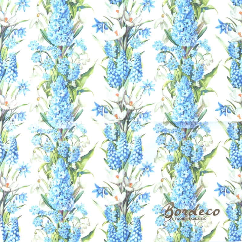 Serwetka do decoupage seria DAISY z motywem kompozycji wiosennych kwiatów: hiacyntów, szafirków, niezapominajek, krokusów i przebiśniegów 33x33cm.