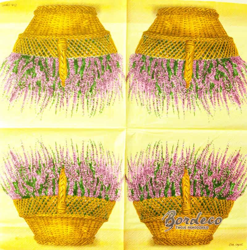 Serwetka do decoupage firmy DESIDN20+ z motywem wrzosu w wiklinowym koszu 33x33cm. Unikat