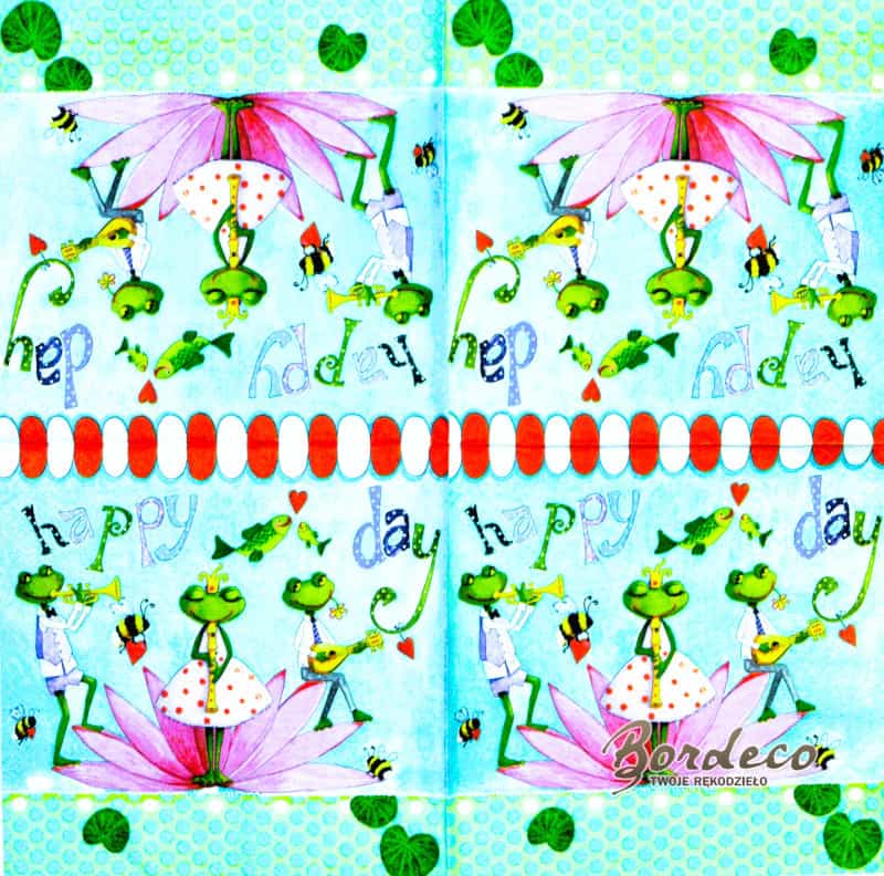 Serwetka do decoupage firmy COLOURFUL LIFE z motywem żabek grających na instrumentach muzycznych 33x33cm. Unikat.