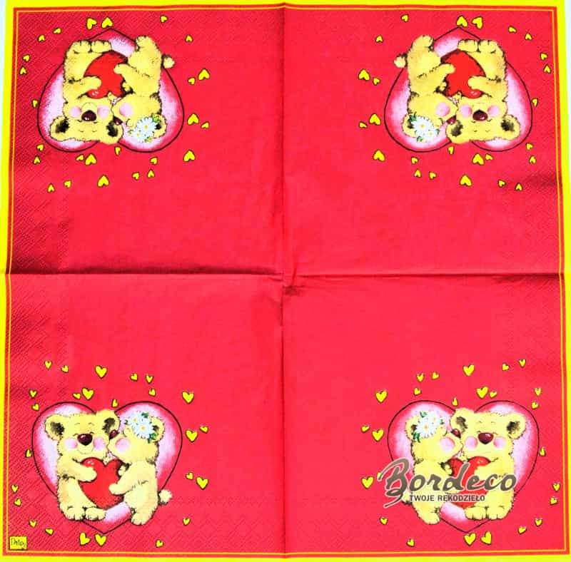 Serwetka do decoupage seria DAISY z motywem zakochanych misiów z serduszkiem na czerwonym tle 33x33cm. Unikat